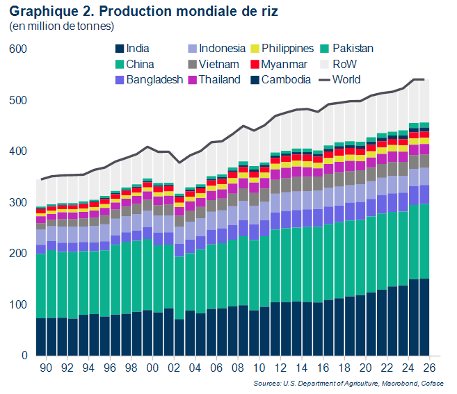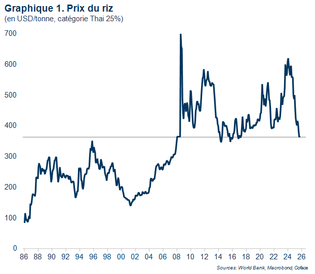 Depuis 2022, l’Inde, premier exportateur mondial, avait restreint ses ventes à l’export pour contenir l’envolée des cours mondiaux (hausse des prix de 19% en 2022 et 2023) liée notamment à la guerre en Ukraine et de mauvaises conditions météorologiques en Asie. La réouverture des exportations en 2024, couplée à des récoltes asiatiques record, a entraîné une chute de 35 % des prix en un an. Compte tenu des prévisions de production à la hausse pour 2026 et du retour potentiel de La Niña au quatrième trimestre 2025, nous anticipons un excédent croissant de l'offre en 2026. Les prix devraient continuer à baisser au moins jusqu'à la fin de 2025, avec une stabilisation probable en 2026 à des niveaux bas inégalés depuis 10 ans.