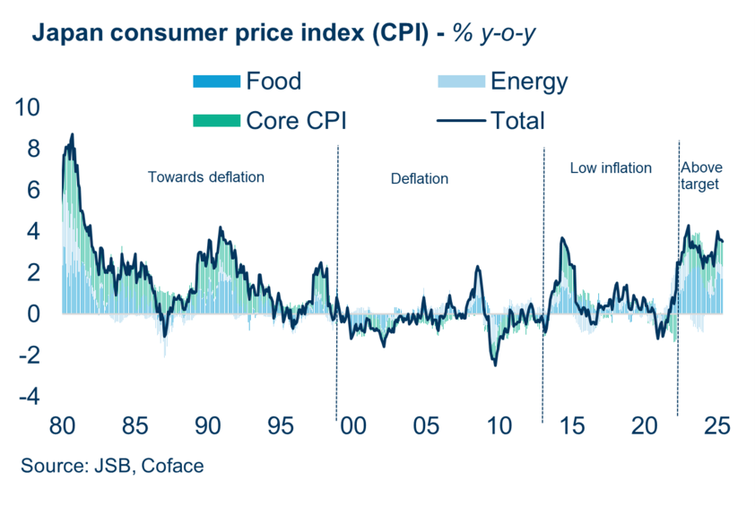 Over the past three decades, occasional inflationary episodes occurred, mostly driven by temporary shocks such as oil price spikes or consumption tax hikes, without lasting pull from domestic demand. This has changed since 2022, when inflation consistently exceeded the Bank of Japan’s 2% target, fueled initially by rising import costs and yen depreciation.