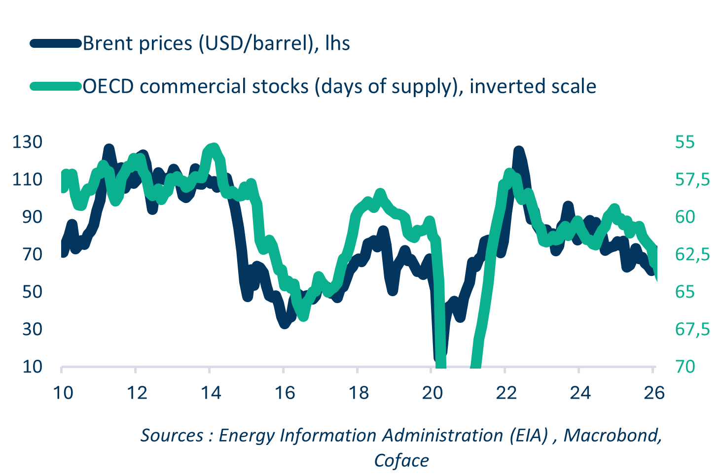 A prolonged $15 increase in Brent crude oil prices could thus reduce global growth by around 0.2 percentage points and add nearly 0.5 percentage points to inflation. In such a context, the risk of stagflation – a combination of weak growth and high inflation – would once again become a credible threat to the global economy, with serious consequences for businesses and international trade.